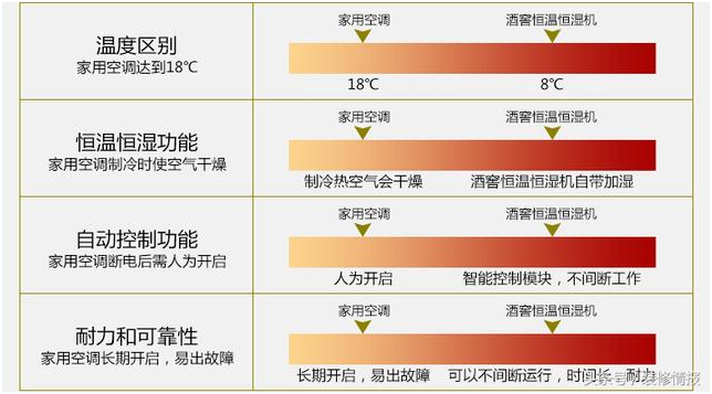 看完了上圖,答案顯而易見。家用空調(diào)的溫度無法達到酒窖的要求,無法做到恒溫恒濕,并不適宜用在酒窖當(dāng)中。酒窖恒溫恒濕空調(diào)有高精度,低故障率、耐用等優(yōu)點,還能自動調(diào)節(jié)室內(nèi)溫度、濕度,這是一般家用空調(diào)不具備的。所以,為了美酒更好的儲存,還是選擇專業(yè)的酒窖恒溫恒濕機比較好。